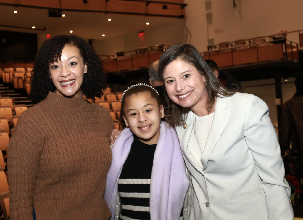 Congresswoman Maggie Goodlander, right, poses for a photo with newly-sworn School Board member Jaimeika Lewis, right, and her daughter Jarabella Lewis, 11.