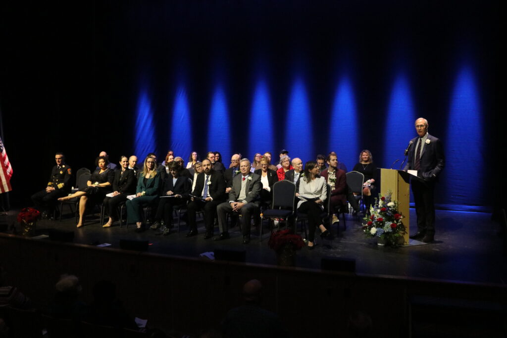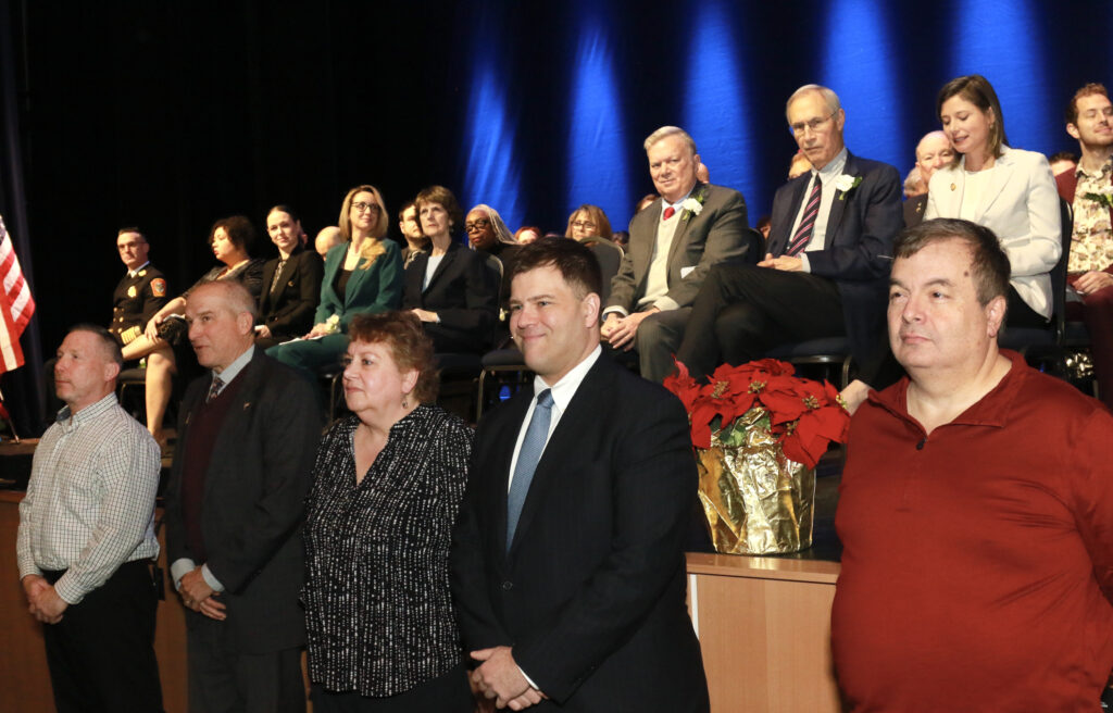 Mayor Jim Donchess, far right, addresses the crowd during the 113th Inauguration at the Nashua Center for the Arts. Photo/Allegra Boverman
