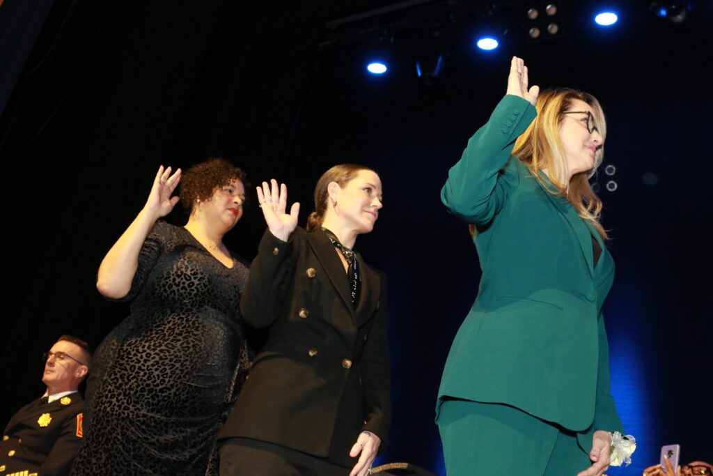 Board of Education members are sworn in including, from left to right, Heather Raymond, Jaimeika Lewis, and Regan Lamphier.
