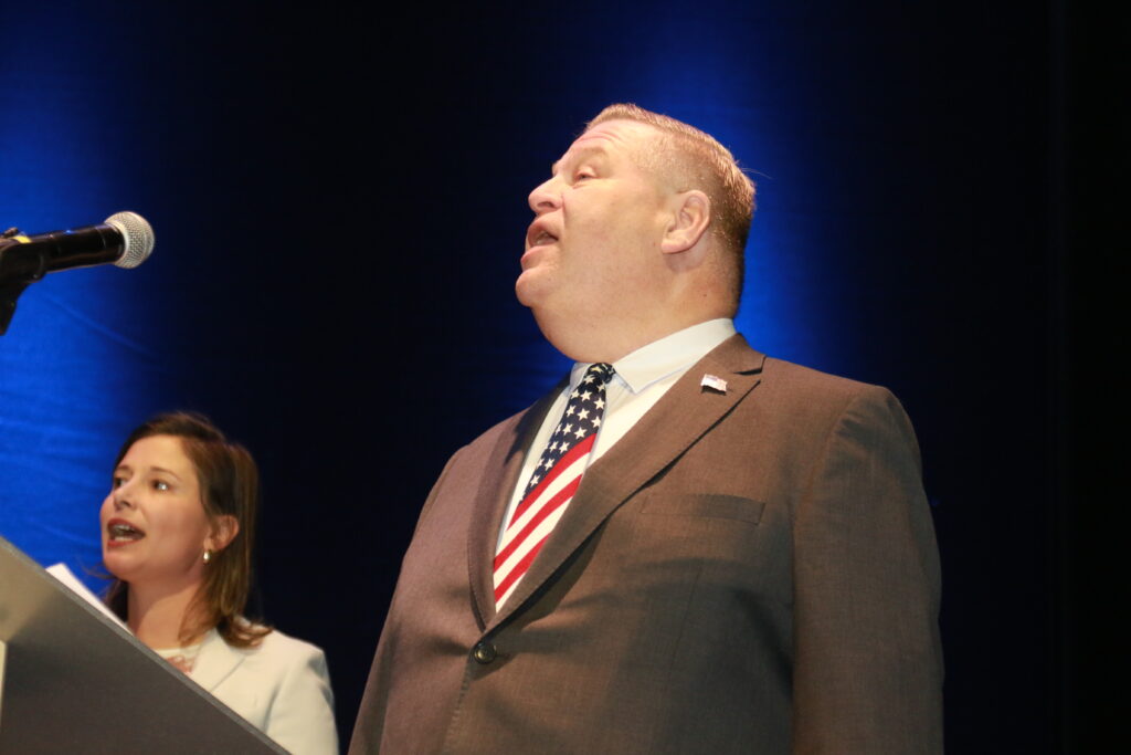 Alan St. Louis, right, led the Star Spangled Banner, alongside Master of Ceremonies Congresswoman Maggie Goodlander.