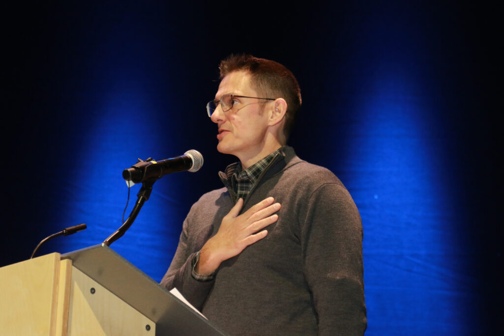 After introductions, the event started with a Presentation of Colors by the honor guards of the Nashua Police Department and the Nashua Fire Department. Nashua ultramarathoner Matty Gregg led the Pledge of Allegiance, and Nashuan Al St. Louis sang the national anthem.